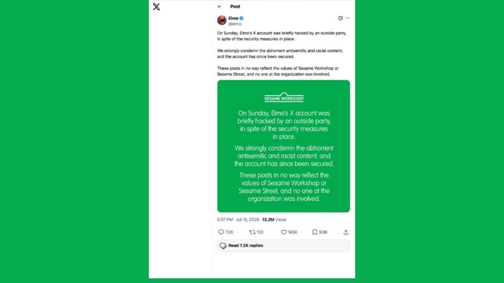 “Elmo’s X account was briefly hacked by an outside party, in spite of the security measures in place. We strongly condemn the abhorrent antisemitic and racist content, and the account has since been secured. These posts in no way reflect the values of Sesame Workshop or Sesame Street, and no one at the organization was involved.”